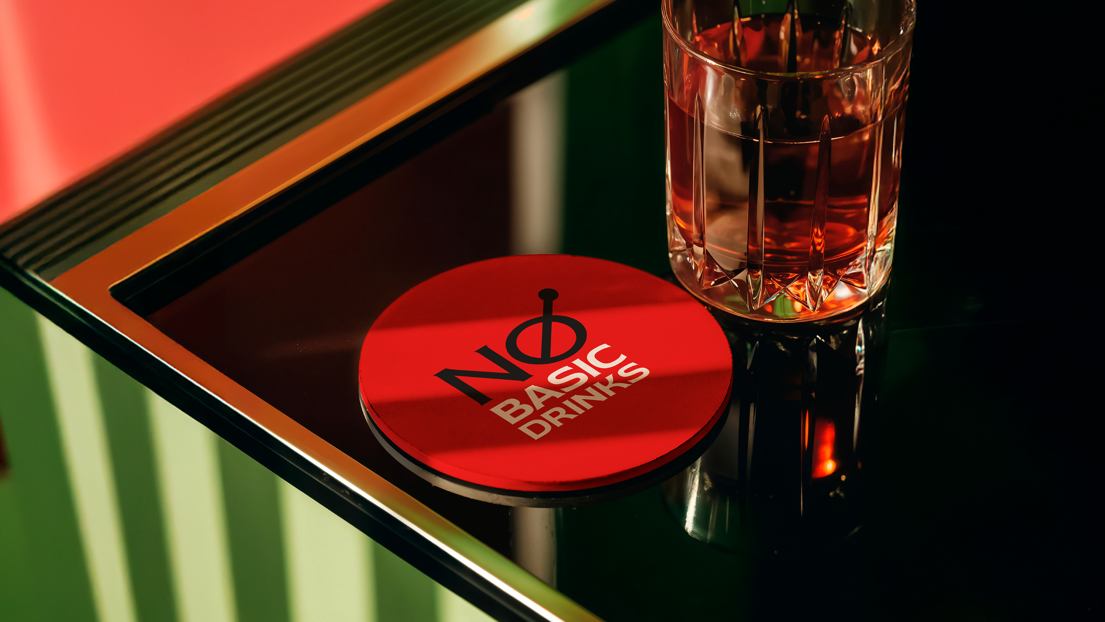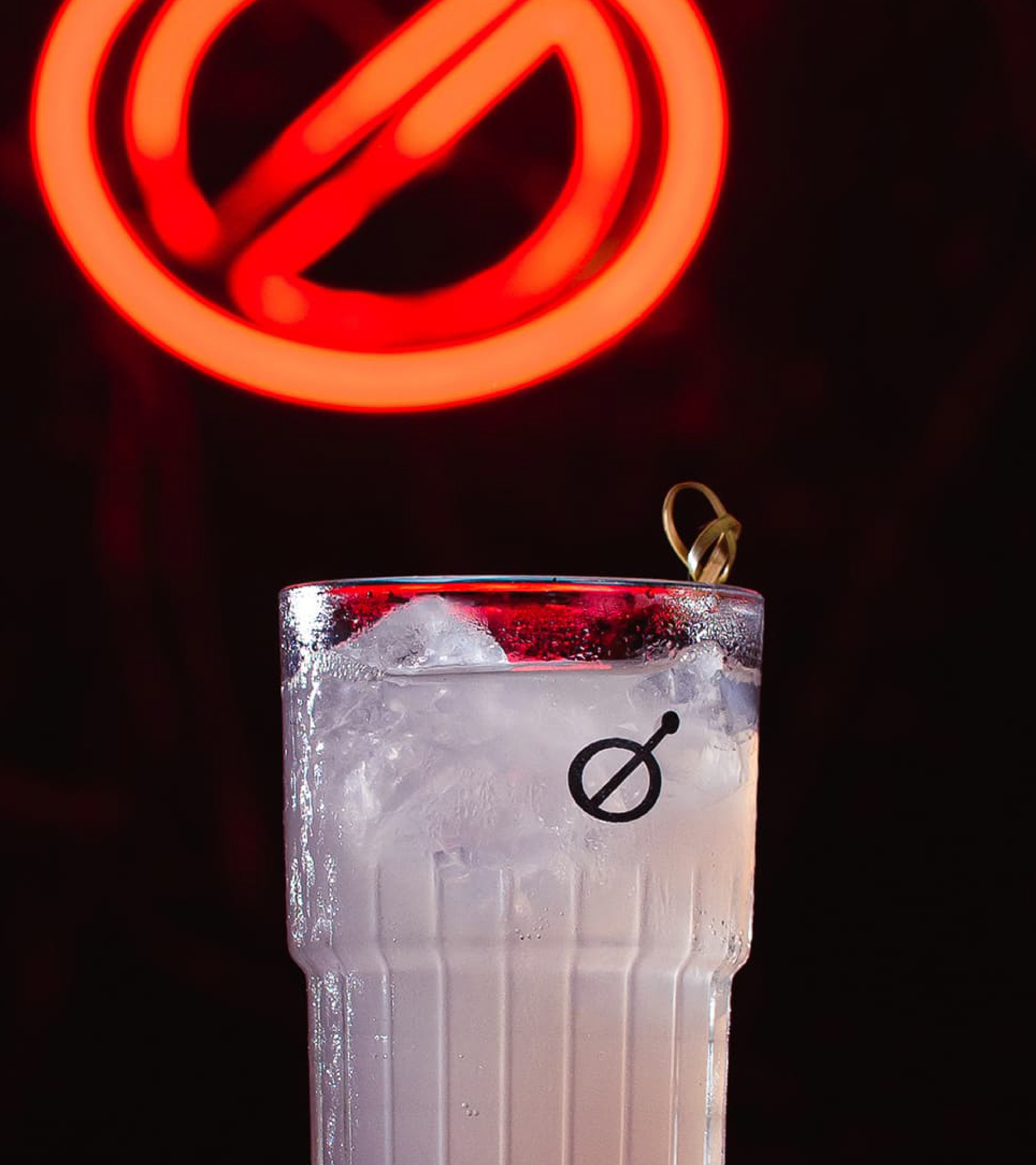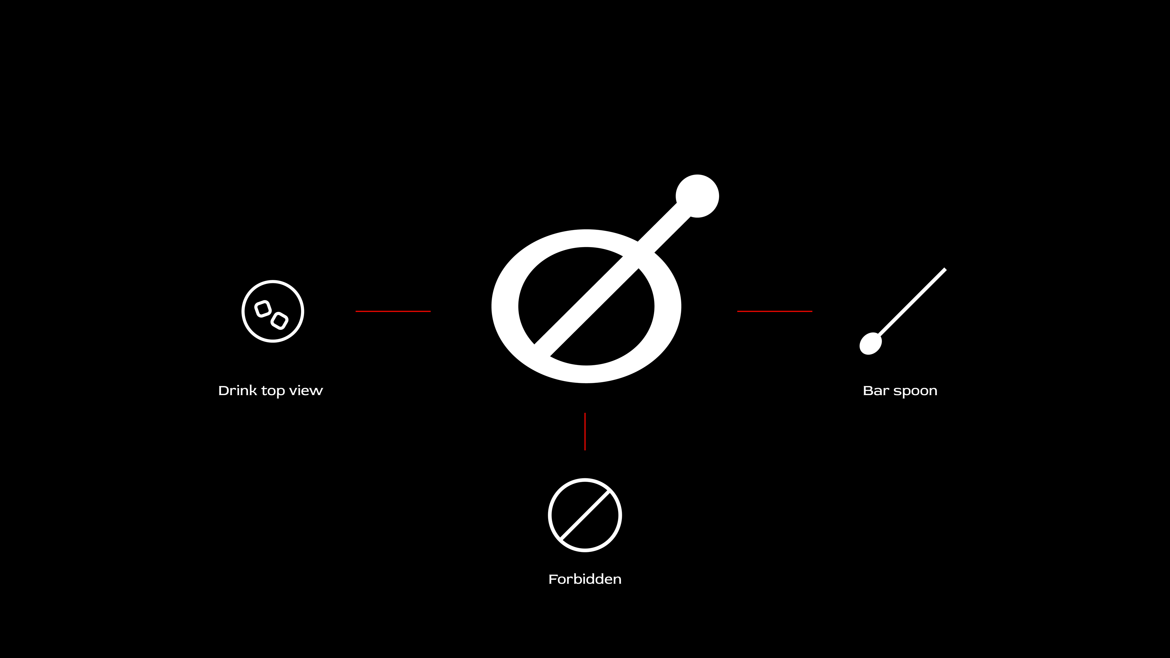 For the symbol, a combination of simple concepts. The drink top, bar spoon, and the prohibition sign convey a protest: here is not a place to talk about work, but to enjoy the moment and have fun.